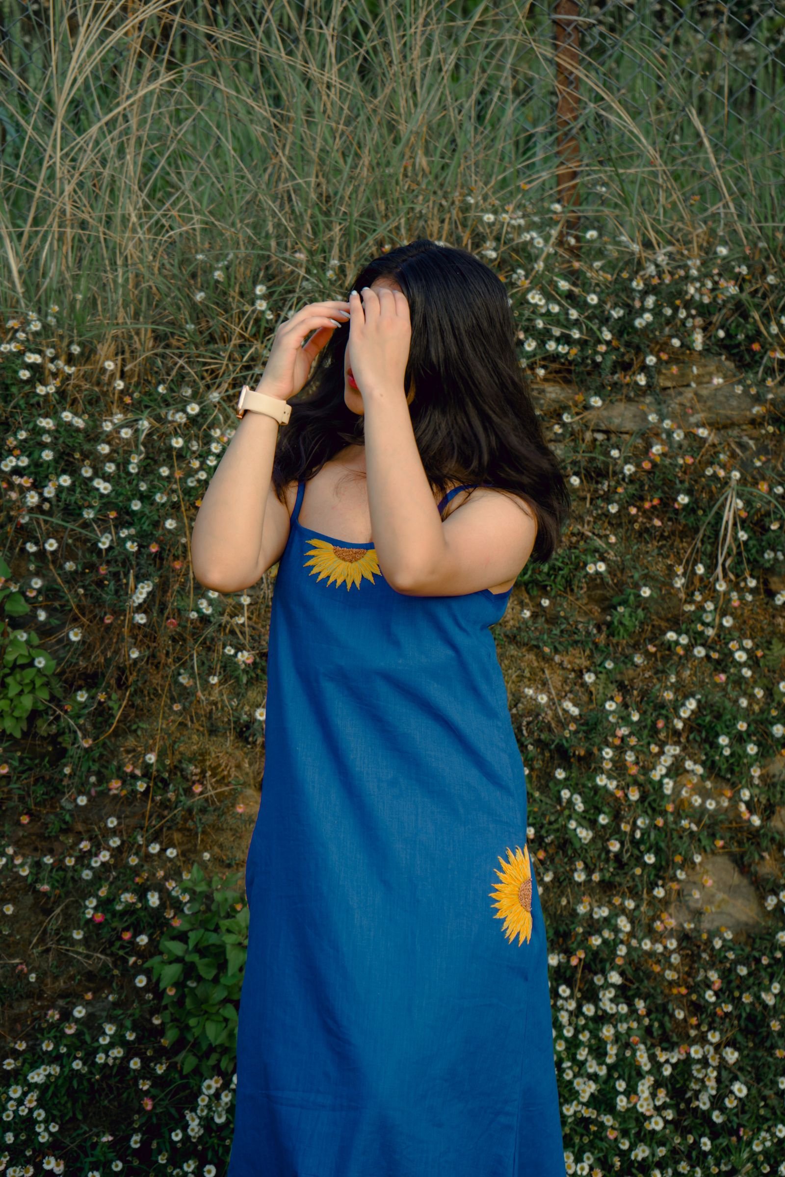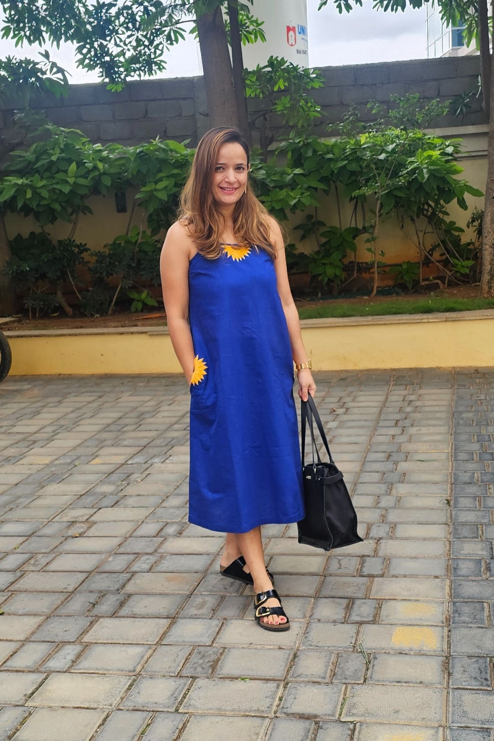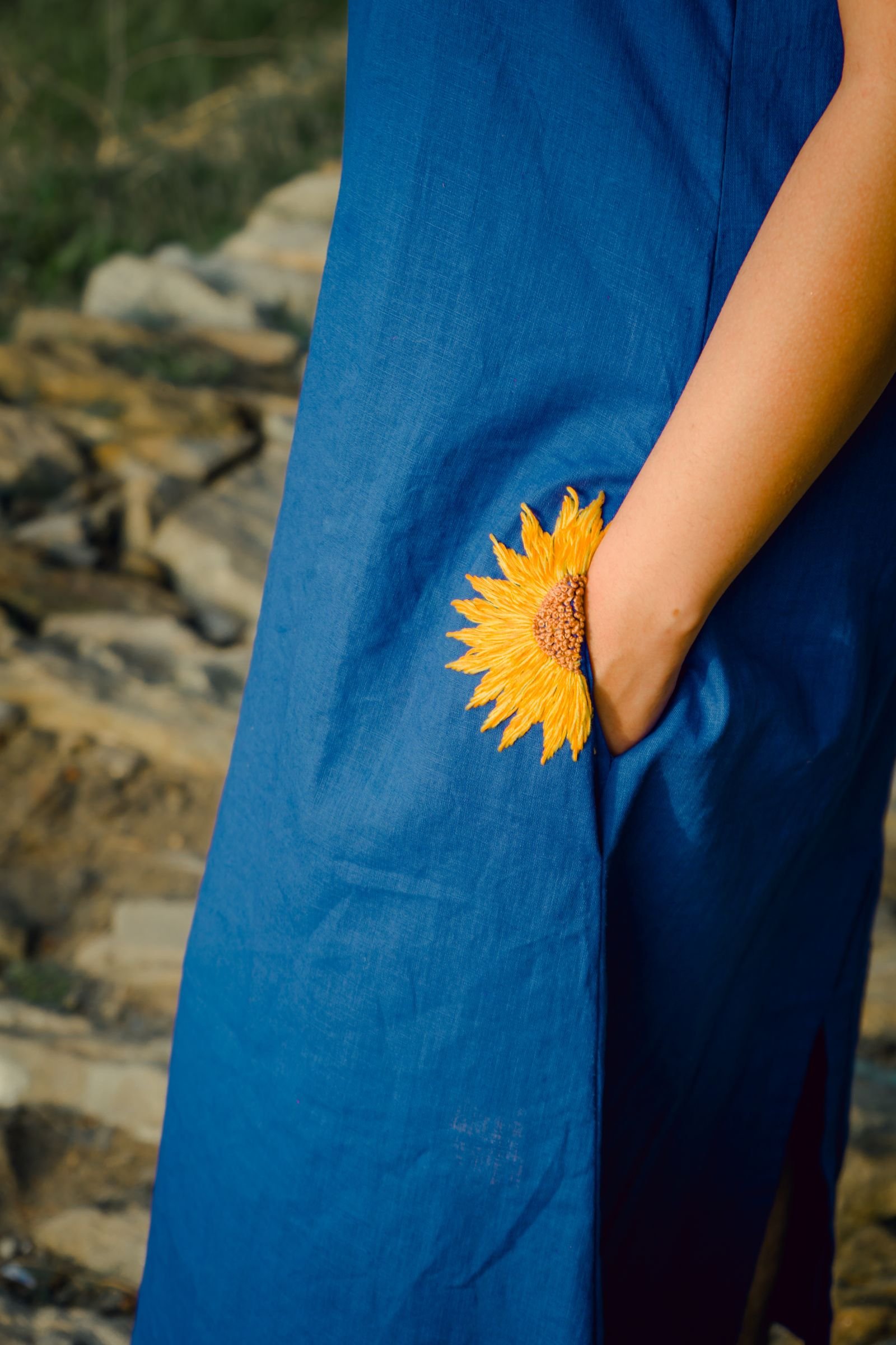 A vibrant electric blue linen-cotton dress adorned with hand-embroidered sunflowers — a perfect blend of comfort and charm.